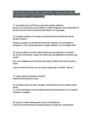 Google Chrome es un navegador web desarrollado por Google con código abierto. Incluye características como pestañas para múltiples páginas, marcadores para guardar páginas favoritas, y un historial de páginas visitadas. Picasa es un programa de Google para editar fotos que permite aplicar efectos y compartir imágenes en Google+. Google Play es una tienda online donde los usuarios de Android pueden descargar aplicaciones, juegos y otros contenidos.