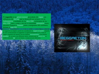El reggaetón es un género musical que se desarrolló a mediados de los años 1980 y principios de los 1990 en Latinoamérica, influenciado por el reggae y el hip hop. Se originó a partir del reggae en español y mantuvo los instrumentos y melodías del reggae original de Jamaica pero con letras diferentes, mientras que en Puerto Rico usaba pistas de rap con composiciones y letras diferentes.