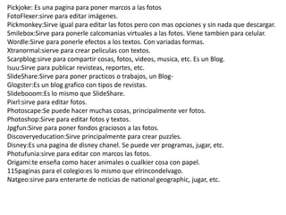 El documento lista varias páginas web y aplicaciones y describe brevemente lo que cada una sirve para, principalmente editar imágenes, crear presentaciones y contenido multimedia, compartir archivos y publicar en blogs y redes sociales. Algunas de las herramientas mencionadas son Pickjoke, FotoFlexer, Pickmonkey, Smilebox, Wordle, Xtranormal, Scarpblog, Isuu, SlideShare, Glogster y Slidebooom.