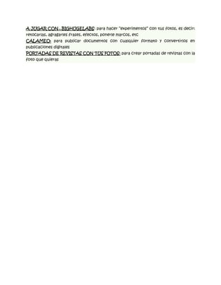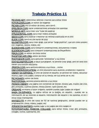 Este documento lista varios sitios web que permiten editar fotos, crear presentaciones y contenido multimedia, publicar revistas y documentos en línea, y explorar contenido educativo y de entretenimiento como Disney, NASA y National Geographic. Algunos sitios como Picjoke.net, Fotoflexer.com y Pixlr.com son editores de imágenes en línea, mientras que otros como Glogster.com, Slideshare.com y Slideboom.com permiten compartir presentaciones y contenido visual. Adicionalmente, se mencionan sitios educativos y de entre