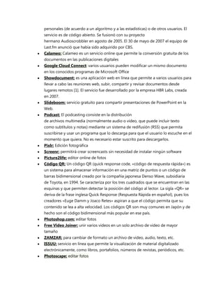 Este documento presenta numerosas herramientas digitales gratuitas para editar audio, video, imágenes y documentos; crear presentaciones, libros digitales y líneas de tiempo; y compartir archivos y trabajos colaborativos en la nube. Algunas de estas herramientas incluyen Prezi, Audacity, Photopeach, Tubechop, Pinterest, Myebook, Dropbox, Google Body, Dipity y Google Cloud Connect.