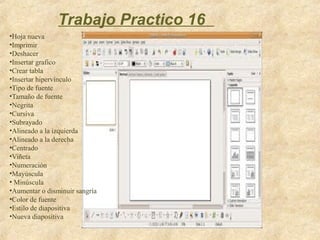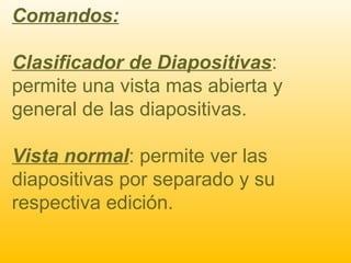 Este documento proporciona una lista de comandos y herramientas disponibles en Microsoft PowerPoint para editar diapositivas e incluir elementos como gráficos, tablas e hipervínculos. También resume la historia de Google, desde su creación como motor de búsqueda por parte de dos estudiantes hasta su lanzamiento como empresa en 1998.