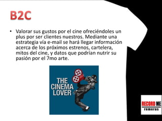 El documento propone una estrategia de marketing relacional para crear una fuerte relación con los clientes amantes del cine mediante ofreciéndoles beneficios como descuentos exclusivos, eventos de cine clásico y cortometrajes, y obsequios para fomentar su lealtad a la marca.
