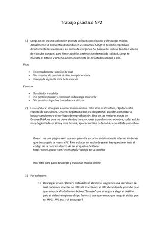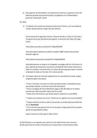 Este documento describe varias herramientas para buscar y descargar música en línea de manera gratuita, como Songr, GrooveShark y Goear. También detalla métodos para descargar videos de YouTube, ya sea a través de software como Atube catcher y VDownloader o páginas web como Kissyoutube y Force Download. Por último, presenta la herramienta Hot Potatoes que permite crear ejercicios educativos interactivos sin programación.