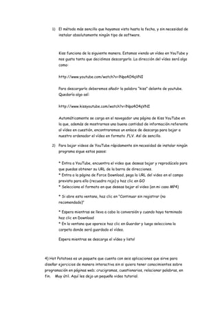 El documento describe varias aplicaciones y sitios web para buscar, escuchar y descargar música. Songr es una aplicación gratuita para buscar y descargar música disponible en 23 idiomas que permite reproducir y descargar canciones y videos de YouTube. GrooveShark es un sitio para escuchar música online de forma intuitiva y rápida que permite crear listas de reproducción. También se mencionan Goear para escuchar música desde la web sin descargarla, y Mix como un sitio para descargar y escuchar música en línea. Finalmente, se describen diferentes métodos
