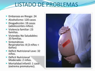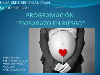 El documento presenta un resumen del proyecto de salud pública de la UNSA-Sede Regional Oran sobre el control de embarazos en riesgo en el Área Operativa IX Los Nogales. El proyecto busca capacitar a mujeres embarazadas, parejas y la comunidad sobre los cuidados durante el embarazo a través de visitas domiciliarias y talleres. Se realizará un diagnóstico inicial y se implementarán 10 talleres semanales con temáticas sobre el embarazo, controles médicos y cuidado del recién nacido para