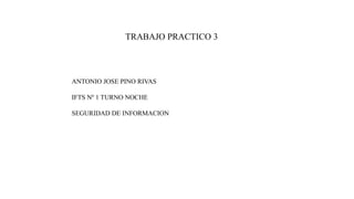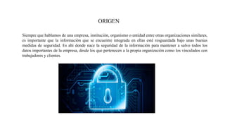 El documento habla sobre la seguridad de la información. Define la seguridad de la información como un conjunto de técnicas y medidas para proteger los datos de una empresa y asegurar que solo los usuarios autorizados puedan acceder y modificar la información. Explica que la seguridad de la información busca garantizar la confidencialidad, integridad, disponibilidad y autenticación de los datos a través de servicios como la criptografía y la identificación. Finalmente, concluye que la seguridad de la información es un aspecto importante para cualquier organización
