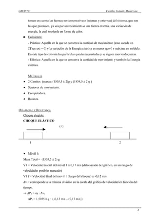 Este documento presenta los conceptos teóricos de cantidad de movimiento, energía cinética y mecánica para sistemas de partículas. Describe un experimento de colisión elástica entre dos carritos y los cálculos de variación de cantidad de movimiento y energía cinética para cada carrito y el sistema. Concluye que aunque hay errores en las mediciones, la variación de cantidad de movimiento y energía cinética calculadas están dentro del rango de error, por lo que se conservan en la colisión elástica como se predijo teóric