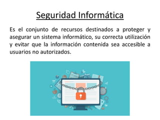 El documento trata sobre el tema de la seguridad informática. Define conceptos clave como virus, hacker, cracker, seguridad lógica y física, firewall y antivirus. Explica que la seguridad informática protege los sistemas informáticos y la información contenida de usuarios no autorizados a través de recursos y medidas tanto físicas como lógicas.