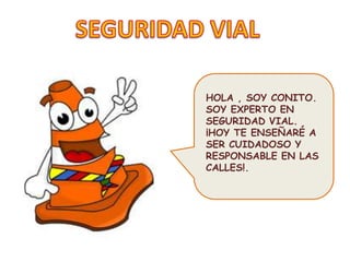 El documento presenta una lección sobre seguridad vial impartida por Conito a los niños. Explica conceptos básicos como las señales de tránsito, el semáforo y la importancia de enseñar estas reglas a los padres para prevenir accidentes.