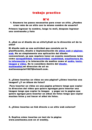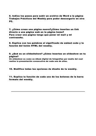 Este documento contiene preguntas sobre cómo crear y personalizar un sitio web en Weebly. Algunas de las preguntas cubren cómo insertar videos, imágenes, álbumes de fotos y enlaces, así como cómo crear páginas nuevas y slideshows. También pregunta sobre la función del código embed y los botones de formato en Weebly.