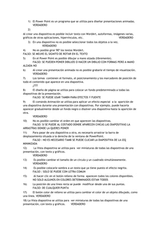 Este documento resume las principales características y funciones del programa Power Point para crear presentaciones. Explica la diferencia entre diseño de diapositiva y tema, cómo aplicar animaciones y transiciones entre diapositivas, e incluye instrucciones sobre cómo modificar elementos, cambiar el orden de diapositivas y agregar fondos.
