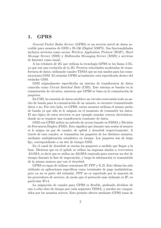 Este documento describe las tecnologías GPRS y EDGE para redes GSM. GPRS proporciona servicios móviles de datos a velocidades de 9 a 150 kbps. EDGE es una mejora a GPRS que permite mayores tasas de transferencia de datos de hasta 384 kbps utilizando modulación 8-PSK. Aunque GPRS y EDGE usan diferentes modulaciones, no requieren cambios en la infraestructura central de la red.