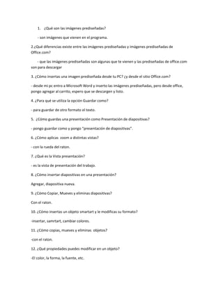 El documento describe diferentes características y funciones de Microsoft PowerPoint. Explica que las imágenes prediseñadas son imágenes que vienen con el programa, mientras que las de Office.com se pueden descargar. Detalla cómo insertar imágenes desde un PC o Office.com y cómo guardar una presentación como presentación de diapositivas. También cubre cómo aplicar zoom, insertar y modificar diapositivas y objetos, y formato de texto.