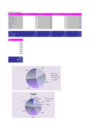 El resumen presenta los ingresos por temporada de una empresa. La temporada de primavera generó los mayores ingresos (44% del total anual) seguida por el verano con 36%. El otoño y el invierno tuvieron las participaciones más bajas con 5% y 16% respectivamente.