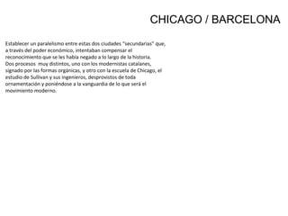 El documento establece un paralelismo entre las ciudades de Chicago y Barcelona a finales del siglo XIX e inicios del XX. Describe los orígenes y rápido crecimiento de Chicago, así como el gran incendio de 1871 y la reconstrucción de la ciudad con nuevos métodos constructivos. También describe el desarrollo del Modernismo catalán en Barcelona y la Escuela de Chicago, marcando diferencias en sus enfoques pero también legados para la arquitectura moderna.