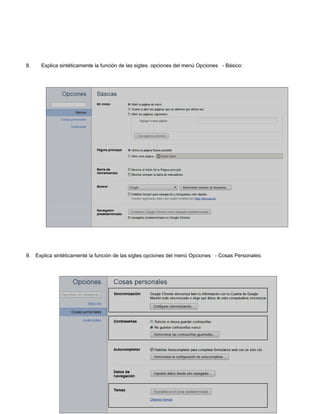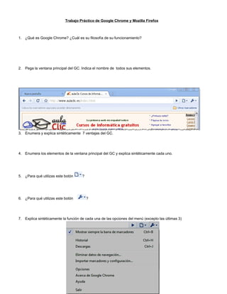 El documento describe las características y funciones de los navegadores Google Chrome y Mozilla Firefox. Explica los elementos de sus ventanas principales, como pestañas, barras de herramientas y menús. Detalla cómo configurar opciones como temas, sincronización, privacidad y lugares de descarga.