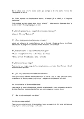 Este documento proporciona instrucciones sobre cómo aplicar formatos y elementos a diapositivas de PowerPoint, como temas, formatos de texto, imágenes, tablas, videos y más. También explica cómo guardar y compartir una presentación en diferentes formatos como PDF y video.