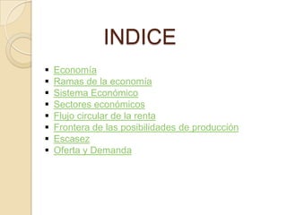 Este documento presenta conceptos clave de la microeconomía y la macroeconomía. Brevemente describe la economía, las ramas principales (micro y macroeconomía), los sectores económicos (primario, secundario y terciario), el flujo circular de la renta, la frontera de posibilidades de producción, la escasez, y los conceptos de oferta y demanda.