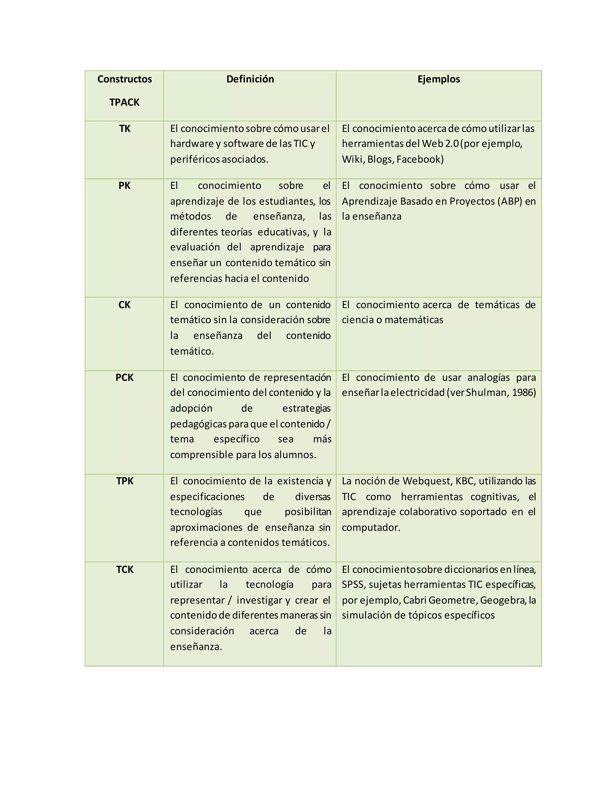 El documento describe los diferentes constructos del TPACK (Conocimiento Tecnológico Pedagógico del Contenido). Estos incluyen el conocimiento tecnológico (TK), el conocimiento pedagógico (PK), el conocimiento del contenido (CK), el conocimiento pedagógico del contenido (PCK), el conocimiento tecnológico pedagógico (TPK), el conocimiento tecnológico del contenido (TCK) y el conocimiento tecnológico pedagógico del contenido (TPACK). Para cada constructo,