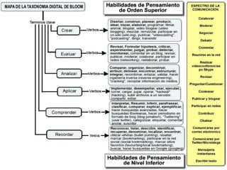 Este documento describe los elementos clave del conocimiento pedagógico del contenido y la tecnología (TPACK) y la importancia de integrar los conocimientos del contenido, la pedagogía y la tecnología. Se explican diferentes tipos de conocimiento a nivel individual, entre pares y de forma conjunta. También se resaltan nuevos verbos para la taxonomía de Bloom que reflejan las actividades posibles en un entorno digital y cómo estas actividades pueden aplicarse para recordar, comprender, aplicar, analizar y evaluar información.