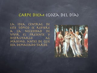 Este documento presenta una introducción a varios tópicos literarios que se han utilizado a lo largo de la historia de la literatura. Brevemente describe cuatro de estos tópicos: "Carpe diem" o aprovechar el día, "Tempus fugit" sobre la fugacidad del tiempo, "Poder igualatorio de la muerte" respecto a que la muerte es igual para todos, y "Beatus ille" sobre la vida sencilla alejada del mundanal ruido.