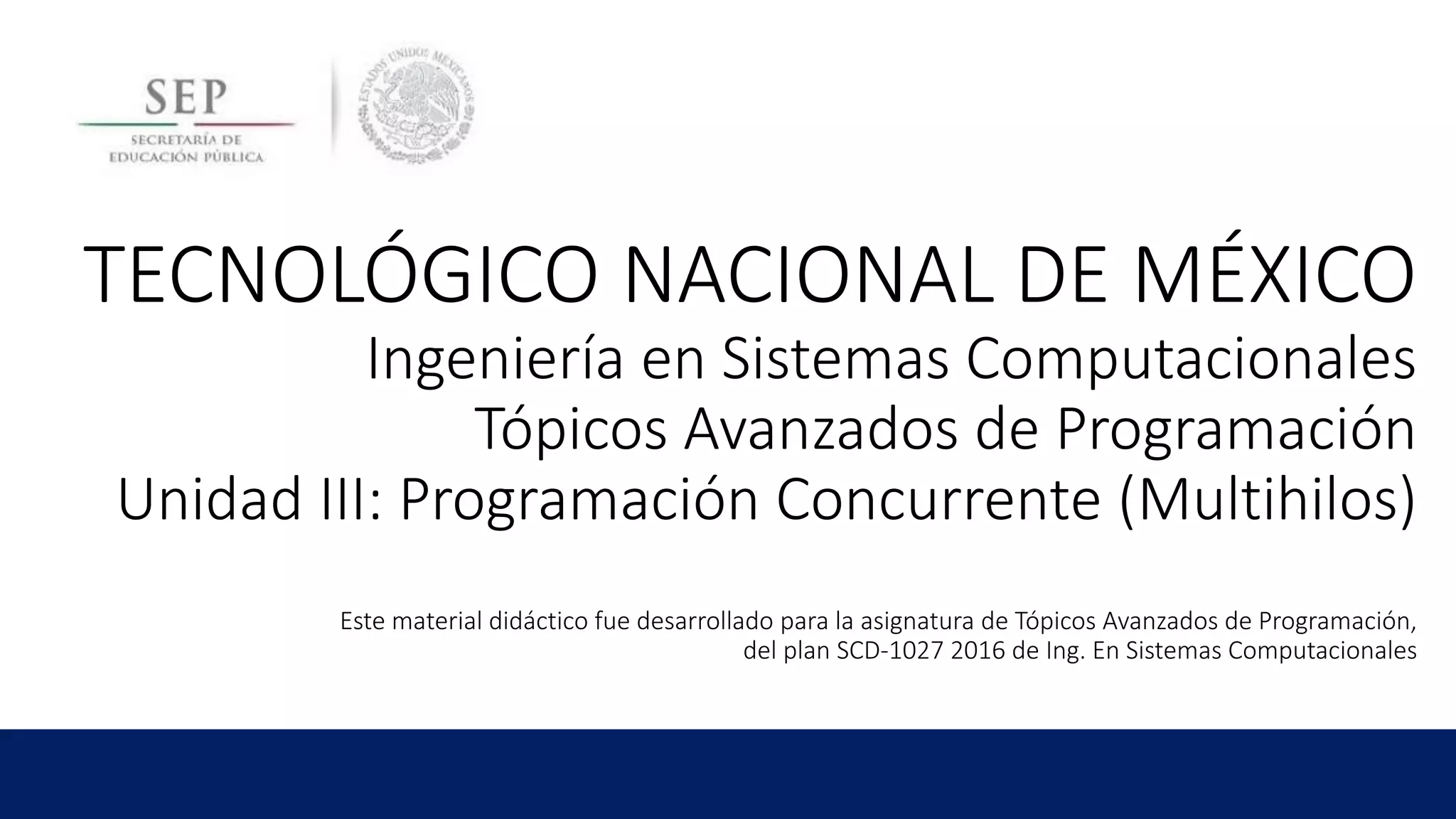 El documento presenta un material didáctico sobre programación concurrente en el contexto de un curso de ingeniería en sistemas computacionales, centrado en el uso de hilos o threads. Se abordan conceptos clave como la creación, gestión y sincronización de hilos en un entorno de programación .NET, incluyendo técnicas para evitar condiciones de carrera y el interbloqueo. Además, se enfatiza la importancia de la concurrencia y las limitaciones que conlleva, así como ejemplos prácticos para ilustrar el uso efectivo de los hilos.