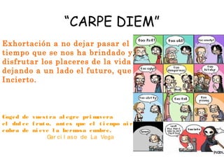 Este documento presenta resúmenes breves de varios tópicos literarios recurrentes en la literatura española, como "Carpe diem" sobre aprovechar el tiempo, "Ubi sunt" sobre la fugacidad de la vida, y "Locus amoenus" sobre la idealización de lugares paradisíacos en armonía con la naturaleza.