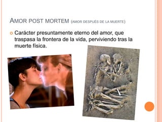 Este documento presenta resúmenes de varios tópicos literarios como el amor después de la muerte, el goce de la juventud, la naturaleza transitoria de la vida, y la vida como un sueño o un viaje. Incluye definiciones breves de cada tópico junto con ejemplos literarios ilustrativos.