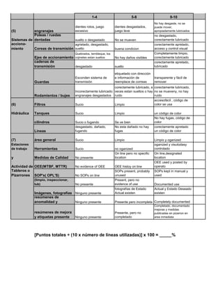 Este documento proporciona una lista de verificación para evaluar el estado de una máquina o línea de producción. La lista contiene 7 secciones que evalúan diferentes aspectos como la limpieza general, el estado de los componentes mecánicos, la lubricación y el mantenimiento. Se asigna un puntaje de 1 a 4 puntos para cada elemento dependiendo de su condición. Un puntaje más alto indica un estado más limpio y mejor mantenido.
