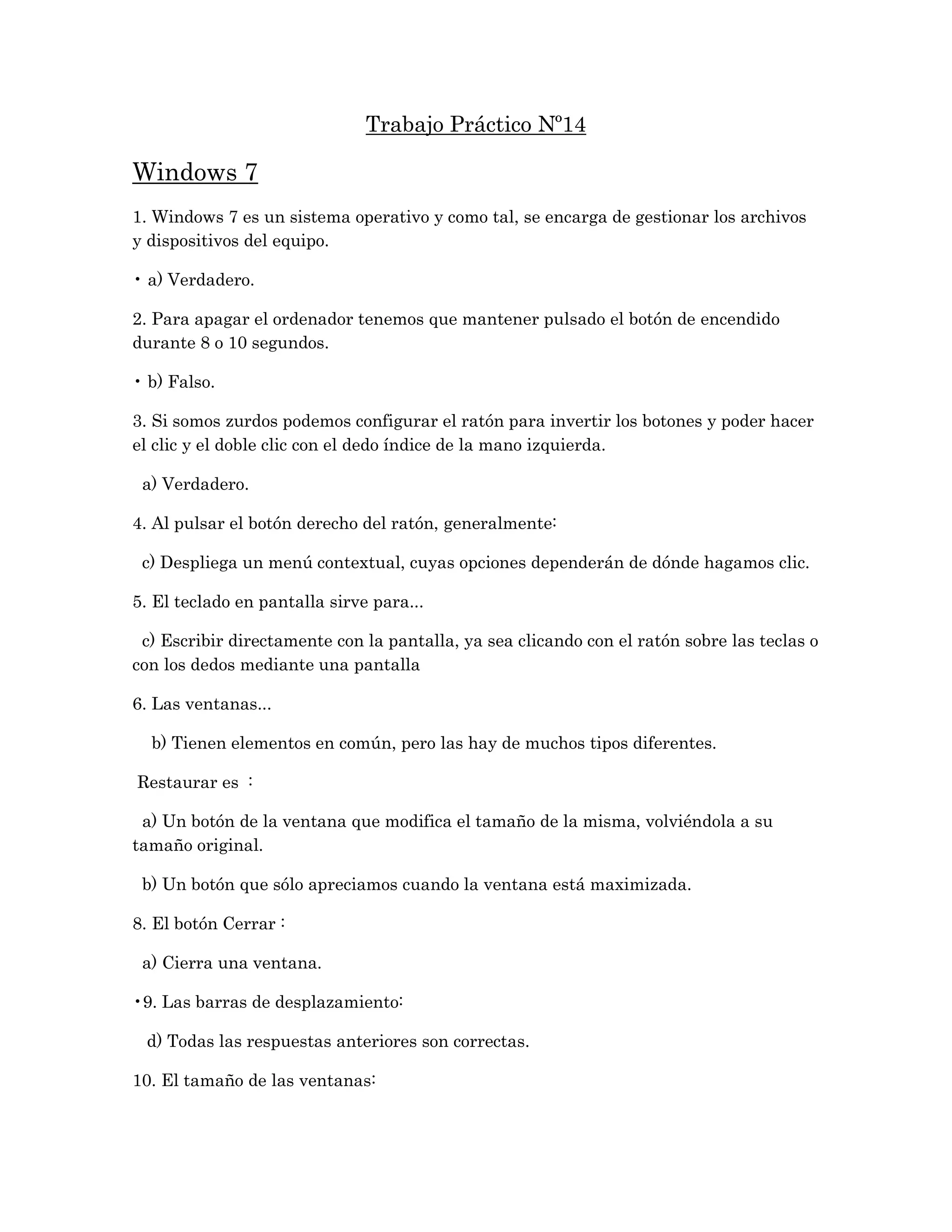 Este documento presenta una serie de preguntas y respuestas sobre el sistema operativo Windows 7. Cubre temas como el uso básico de Windows 7, el explorador de archivos, la búsqueda de archivos, la papelera de reciclaje, aplicaciones preinstaladas como el bloc de notas y la calculadora, el reproductor multimedia, la ayuda y soporte técnico, la configuración de la impresora, personalización del escritorio y la configuración del ratón y panel táctil.