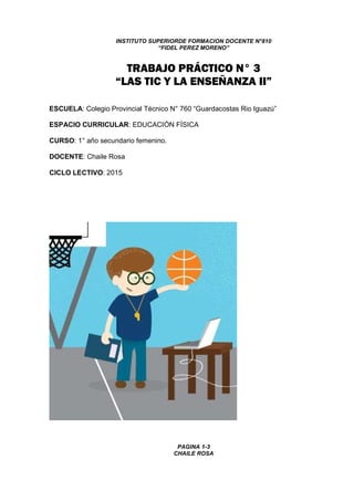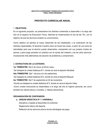 Este documento presenta el proyecto curricular anual de Educación Física para 1° año secundario femenino. Se detallan 3 unidades didácticas que abarcan los deportes de handball, básquet y voley a lo largo de los 3 trimestres. También incluye una unidad transversal sobre higiene, valores y alimentación. El objetivo es desarrollar las habilidades de los estudiantes e implementar el uso de TIC. Se utilizarán métodos como la resolución de problemas y la creación de un blog para ampliar el