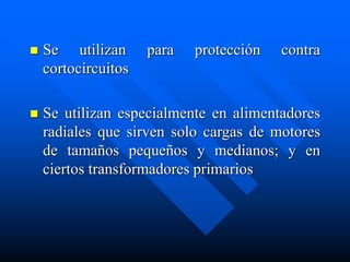 Los relés de sobrecorriente se utilizan para protección contra cortocircuitos. Existen relés de sobrecorriente instantáneos y de relación tiempo-corriente inversa. Los relés de sobrecorriente instantáneos actúan de manera inmediata ante una corriente dada, mientras que los relés de relación tiempo-corriente inversa utilizan curvas de tiempo-corriente para lograr una coordinación adecuada de protecciones.