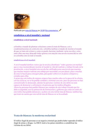 Este documento describe la trata de blancas como una forma moderna de esclavitud que afecta a millones de personas en todo el mundo. Se explica que la trata de blancas es un gran negocio criminal que genera miles de millones de dólares anualmente para las redes criminales que explotan sexualmente a mujeres y niños. El documento también analiza diferentes estrategias y leyes implementadas por países para combatir este problema, como penalizar a los compradores de servicios sexuales en lugar de a las víctimas.