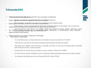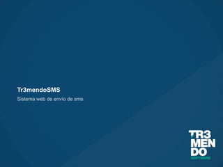 Tr3mendoSMS es un sistema web de envío de SMS que permite enviar mensajes de forma manual y automática a contactos almacenados. Ofrece funciones como alertas, recordatorios, promociones y comunicaciones a clientes de manera sencilla e intuitiva desde cualquier PC con acceso a Internet. El sistema ahorra tiempo y dinero al permitir programar envíos masivos de mensajes de manera fácil y a bajo costo.