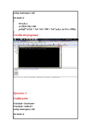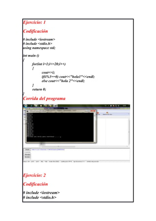 El documento contiene 21 ejercicios de codificación en C++ que resuelven problemas matemáticos y de programación utilizando bucles, condicionales, vectores y matrices. Cada ejercicio presenta el código fuente en C++ y la salida del programa correspondiente.
