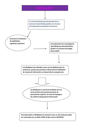 Un WebQuest es una herramienta de aprendizaje guiado que utiliza recursos de Internet para que los estudiantes completen una tarea atractiva que requiere pensamiento crítico. Los profesores usan WebQuest como recurso didáctico para que los estudiantes desarrollen habilidades de manejo de información y competencias digitales mientras resuelven un problema o completan un proyecto.