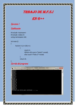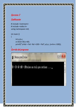 Este documento contiene 21 ejercicios de codificación en C++. Cada ejercicio presenta el código fuente correspondiente y los resultados de su ejecución. Los ejercicios incluyen bucles, condicionales, vectores, matrices y otras estructuras básicas de programación para practicar y reforzar conceptos en C++.