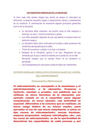 Este documento presenta principios generales sobre la disciplina infantil y enfoques sobre la disciplina escolar. Algunos principios clave son que la disciplina debe comenzar temprano, enfocarse en la edad del niño, reconocer buena conducta y evitar castigos físicos. Los enfoques sobre la disciplina escolar incluyen el entrenamiento para adquirir habilidades y el adoctrinamiento, el cual es considerado un método autoritario que no permite el cuestionamiento crítico.