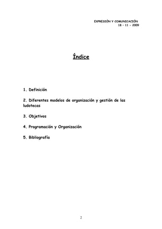 Este documento describe la definición de una ludoteca, diferentes modelos de organización y gestión, objetivos principales como favorecer el desarrollo de los niños a través del juego, y detalles sobre la programación y organización del espacio de la ludoteca para facilitar el juego libre y actividades grupales.