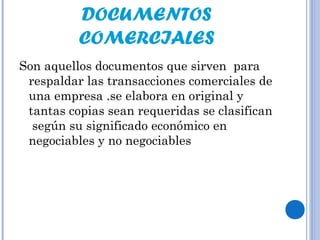 Los documentos comerciales sirven para respaldar las transacciones de una empresa y se clasifican en negociables y no negociables. Los documentos negociables como cheques, letras de cambio y pagarés constituyen o sustituyen el dinero en efectivo para respaldar deudas, mientras que documentos como facturas no son negociables.