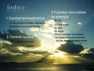 El documento describe diferentes tipos de fuentes de energía, incluyendo centrales termoeléctricas (carbón, petróleo, gas), centrales nucleares, y fuentes renovables como la energía solar, eólica, hidráulica y biomasa. También discute las ventajas e inconvenientes de cada fuente.