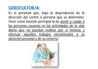 El documento describe los roles de geroicultor/a, auxiliar de ayuda a domicilio, teleoperador/a y instalador/a de teleasistencia. Un geroicultor/a cuida de personas mayores en centros o en sus hogares ayudándolas con tareas diarias y de higiene personal. Un auxiliar de ayuda a domicilio asiste a personas en sus casas con cuidados personales, limpieza y compras. Un teleoperador/a atiende llamadas de personas con dispositivos de teleasistencia gestionando respuestas a emergencias.