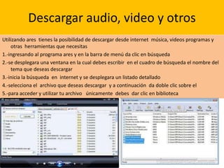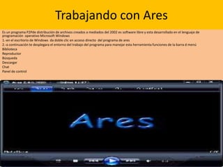 Este documento describe cómo usar el programa P2P Ares para descargar archivos de audio, video y otros desde Internet. Explica que Ares es un programa gratuito desarrollado para Windows que permite buscar y descargar archivos ingresando términos de búsqueda. También muestra cómo realizar descargas directamente desde sitios web como 4shared.com ingresando enlaces de descarga.