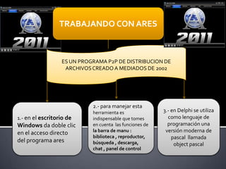 Ares es un programa P2P creado a mediados de 2002 que permite descargar archivos como música, videos y programas de Internet. Para usar Ares, los usuarios deben acceder a las funciones de la barra de menús como biblioteca, reproductor, búsqueda, descarga y chat. Los usuarios también pueden buscar y descargar archivos seleccionándolos en la biblioteca de Ares.