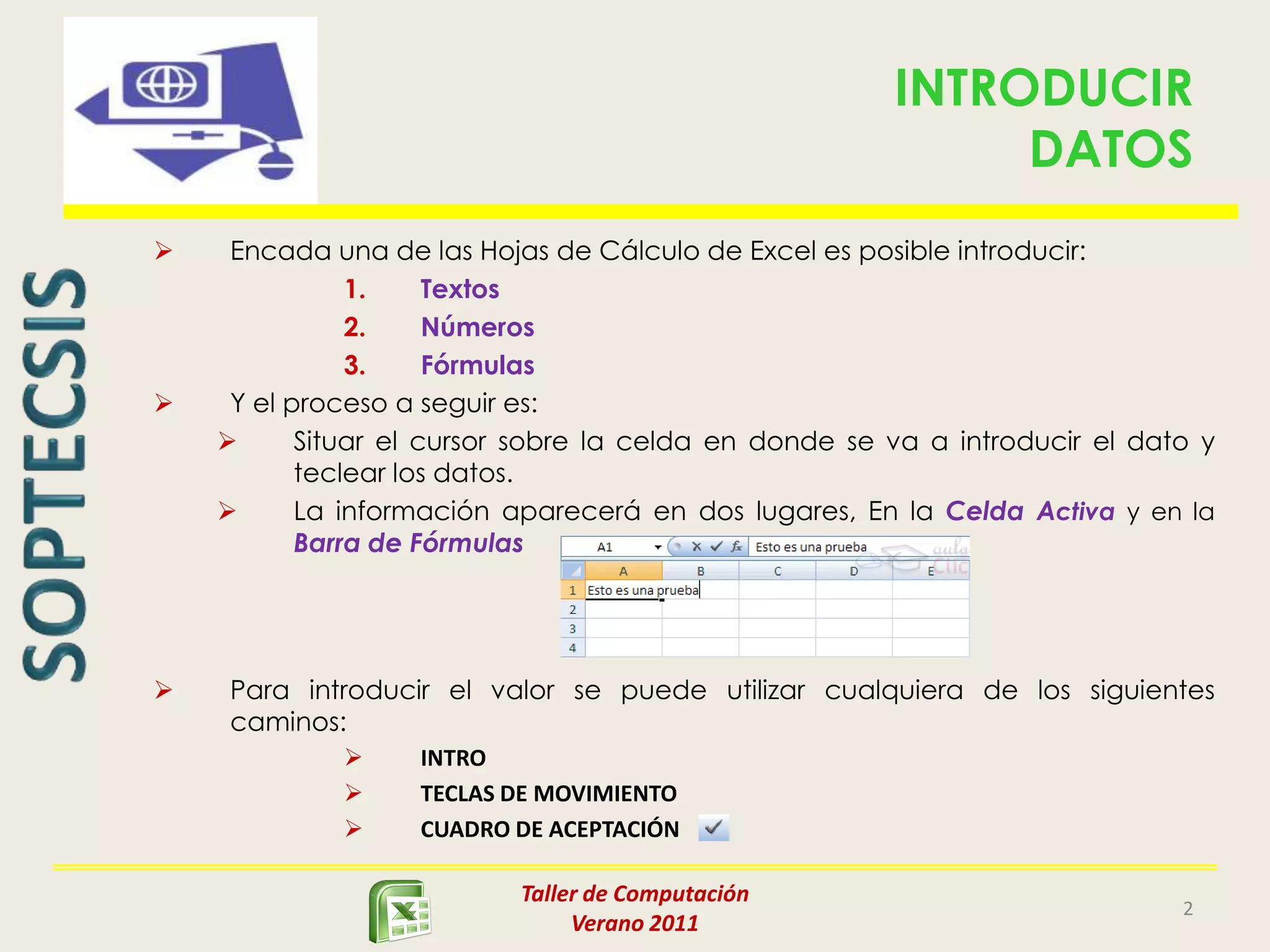 Este documento proporciona instrucciones sobre cómo introducir, modificar y trabajar con diferentes tipos de datos en Excel, incluidos números, texto, fechas, fórmulas y funciones. Explica cómo introducir datos en celdas, modificar datos existentes, y los tipos básicos de datos como valores constantes, fórmulas y funciones. También cubre operadores matemáticos y lógicos, referencias de celdas, y cómo manejar errores comunes.