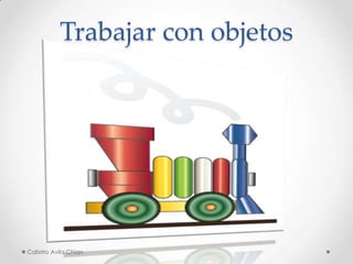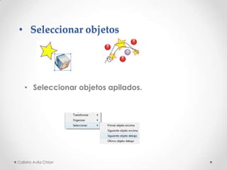 Este documento describe cómo trabajar con objetos en un programa de diseño, incluyendo cómo seleccionar y agrupar objetos, expandir objetos, alinear y distribuir objetos, y crear y colocar símbolos. También explica cómo seleccionar objetos apilados y distribuir objetos de manera uniforme.