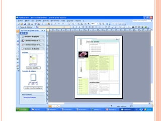 Este documento explica cómo usar Microsoft Publisher para diseñar publicaciones. Describe los diferentes elementos que se pueden incluir como texto, imágenes, tablas y formas. Explica cómo iniciar Publisher y utilizar plantillas para crear publicaciones. También describe las diferentes partes de la ventana de trabajo de Publisher como las barras de herramientas, el clasificador de páginas y el área de trabajo. Por último, explica cómo importar un documento de Microsoft Word a Publisher.