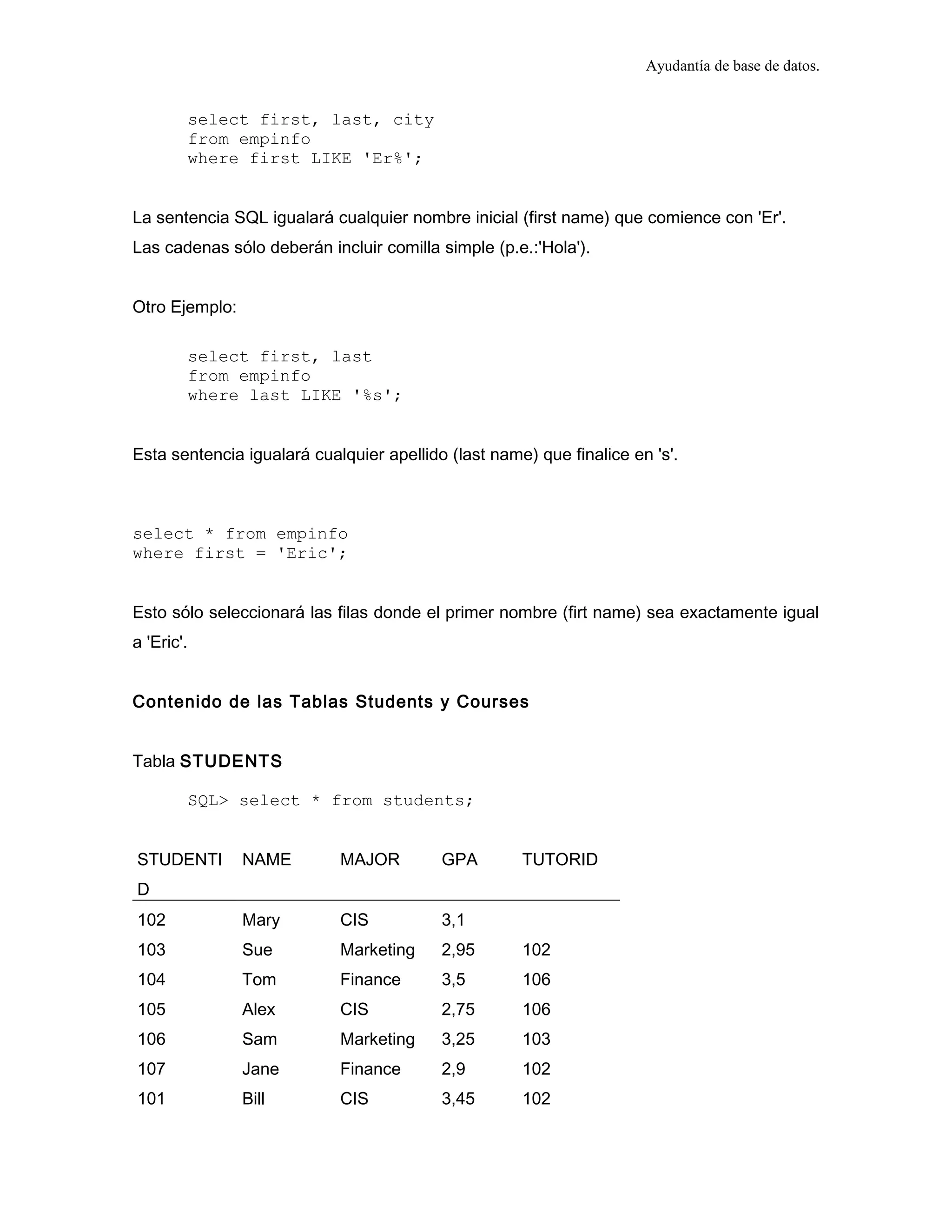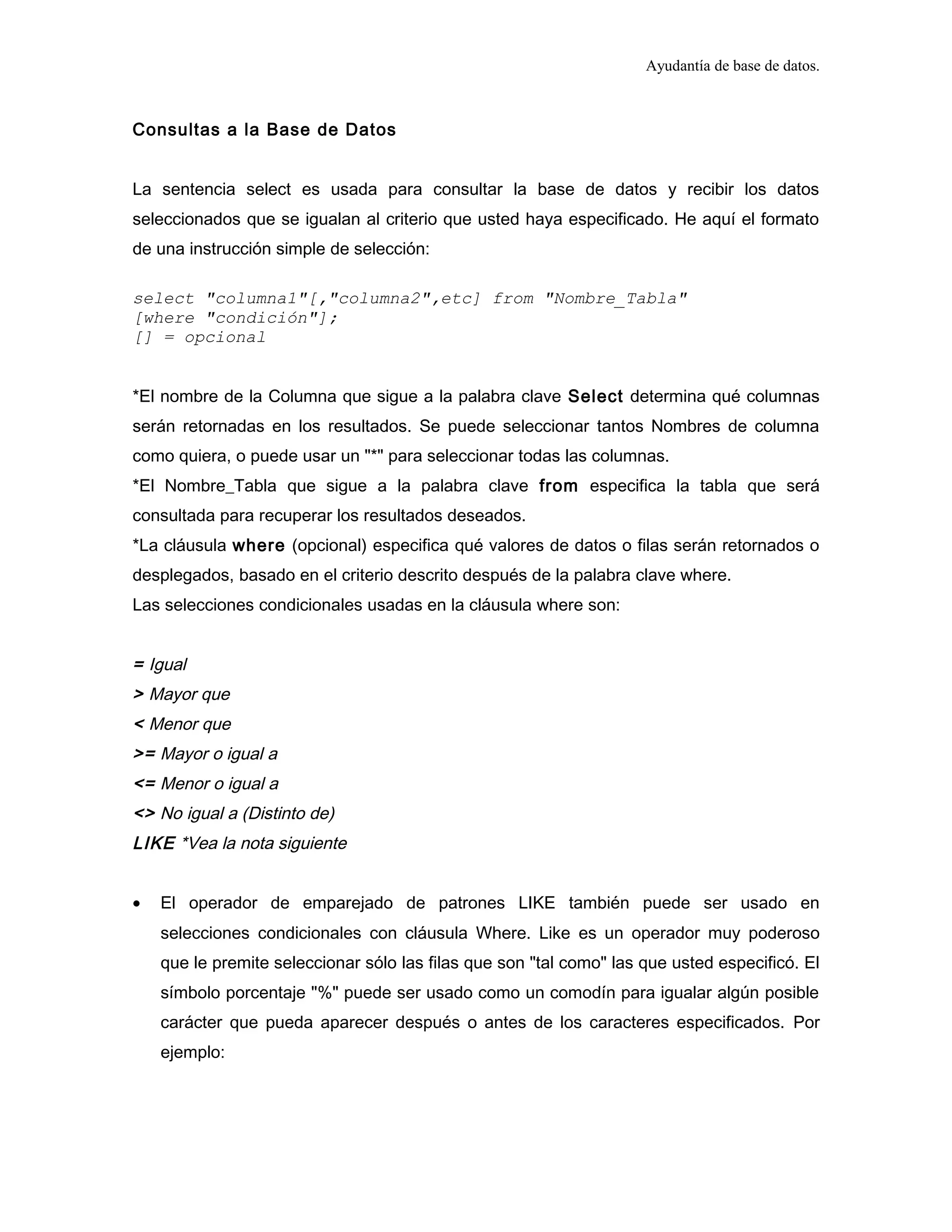 Este documento describe las consultas a una base de datos utilizando el lenguaje SQL. Explica la sentencia SELECT para recuperar datos de una tabla especificada, así como cláusulas como WHERE, LIKE, BETWEEN, IN y ORDER BY para filtrar y ordenar los resultados. También resume funciones como COUNT, AVG, SUM y otras utilizadas comúnmente en consultas SQL.