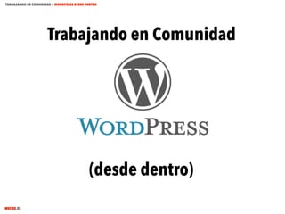 El documento describe la participación de Rafael Poveda en la comunidad de WordPress. Poveda es el CTO de Mecus y un experto en WordPress que ha escrito libros y organizado eventos sobre WordPress. El documento destaca la importancia de la comunidad de WordPress, que incluye cientos de miles de voluntarios que contribuyen código, plugins, temas y apoyo a los usuarios.